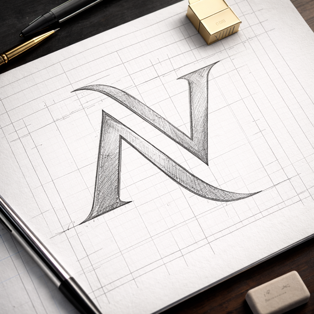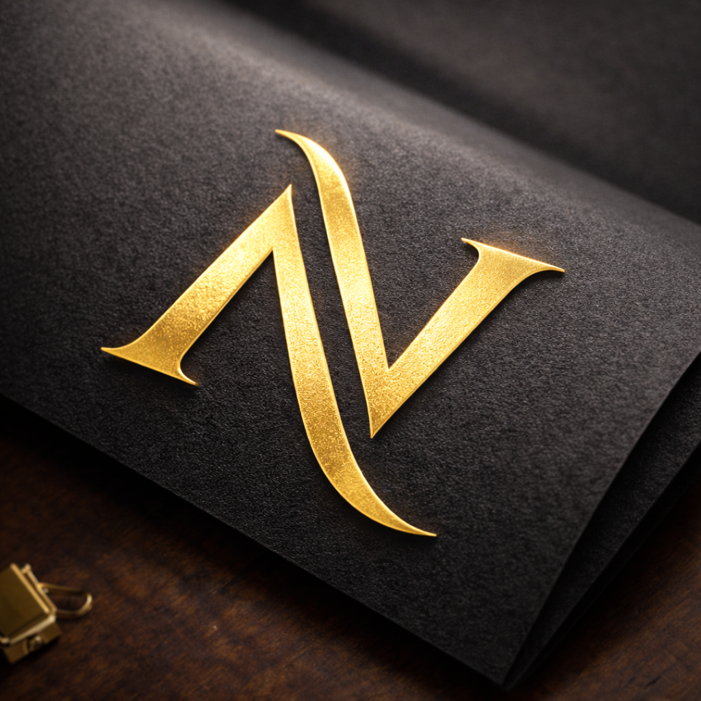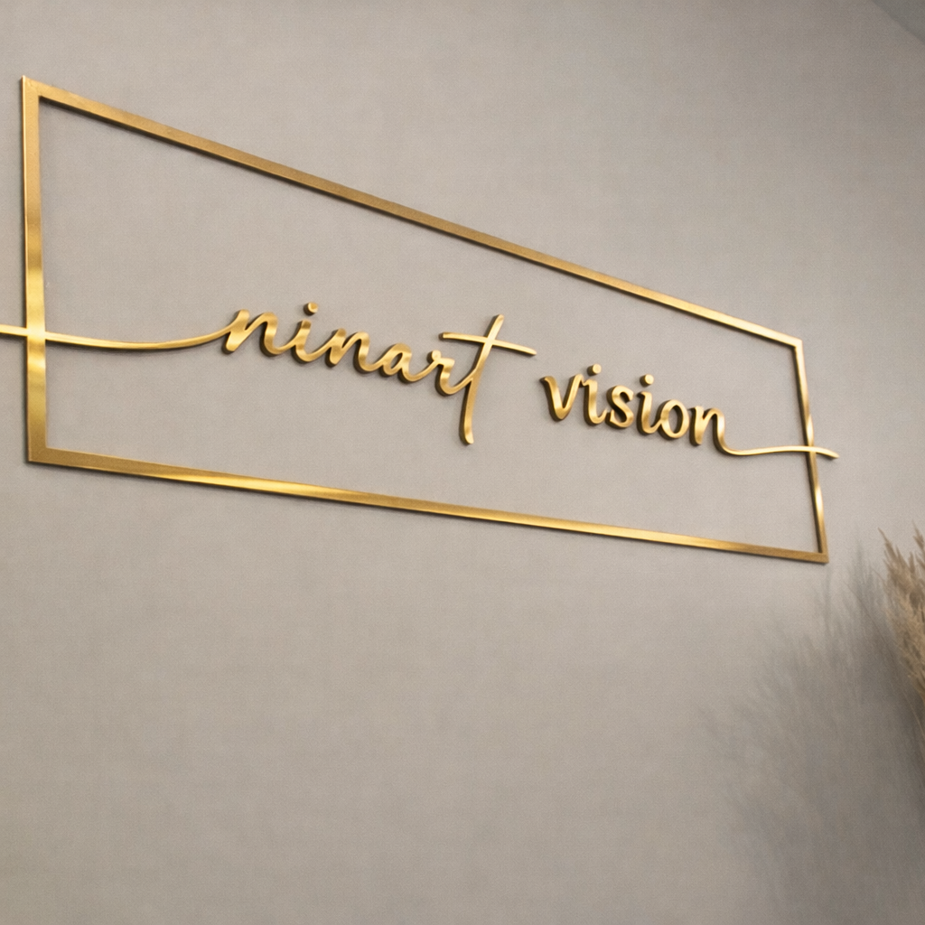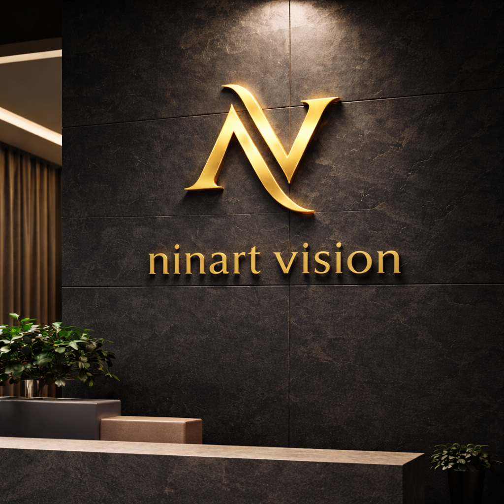 Ninart Vision-ის ლოგო წარმოადგენს მონოგრამას, სადაც „N“ და „V“ ერთიანდება ერთ ელეგანტურ ფორმაში. ოქროს მეტალის ეფექტი სიმბოლურად ასახავს ხარისხს, დეტალებზე ყურადღებასა და პრემიუმ ვიზუალურ იდენტობას. დიზაინი მინიმალისტურია, მაგრამ ძლიერი ხასიათით — რაც სრულად გამოხატავს ბრენდის ესთეტიკას.